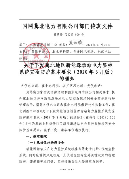 國家電網冀北地區關于新能源場站電力監控系統安全防護基本要求
